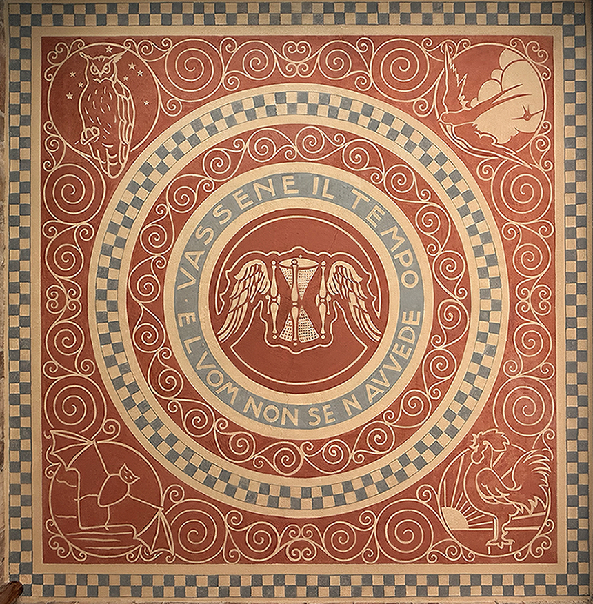 Ascending the short staircase, one enters an open vestibule with two elegant wooden doors and decorative elements of zoomorphic and phytomorphic character once again in wrought iron. Looking up at the ceiling, one encounters rather intriguing and enigmatic decorative painting. A central roundel, containing a winged hourglass, is bordered by concentric bands; one of these bears the Dante quotation “VASSENE IL TEMPO E L’UOM NON SE N’AVVEDE”6 that is, time passes and man does not perceive it. A warning about the fleeting nature of time and the cycle of the day, echoed in part in the corner depictions where stylized animals are represented: a bat and an owl (nocturnal), and two birds traditionally linked with rebirth: the rooster and the swallow. If the rooster is a night-watcher, standing sentinel and heralding the return of the sun, the swallow is connected to the nest and home, becoming a symbol of familial love, and to spring, therefore renewal; a sense of freedom expressed through its ceaseless travels, and of hope for change: a positive message for the homeowner and guest alike, because the swallow suggests, in the face of time that passes, to face difficulties with courage and hope for the future.